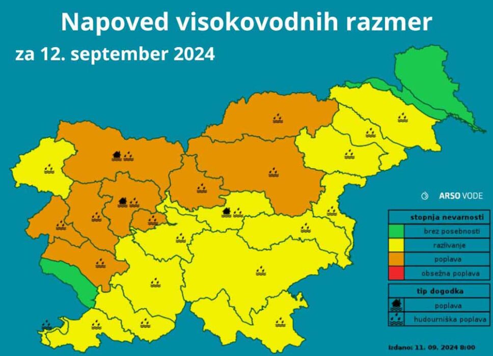Do petka zjutraj lahko v zahodni polovici Slovenije pade od 90 do 140, drugod od 50 do 90 litrov dežja na kvadratni meter. Ob padavinskih pasovih lahko krajevno pade več dežja. “Ob nalivih bodo sprva hitro naraščali hudourniški vodotoki in manjše reke v zahodni Sloveniji, čez dan pa tudi drugod, predvsem v osrednji in severni Sloveniji, “so napovedali.