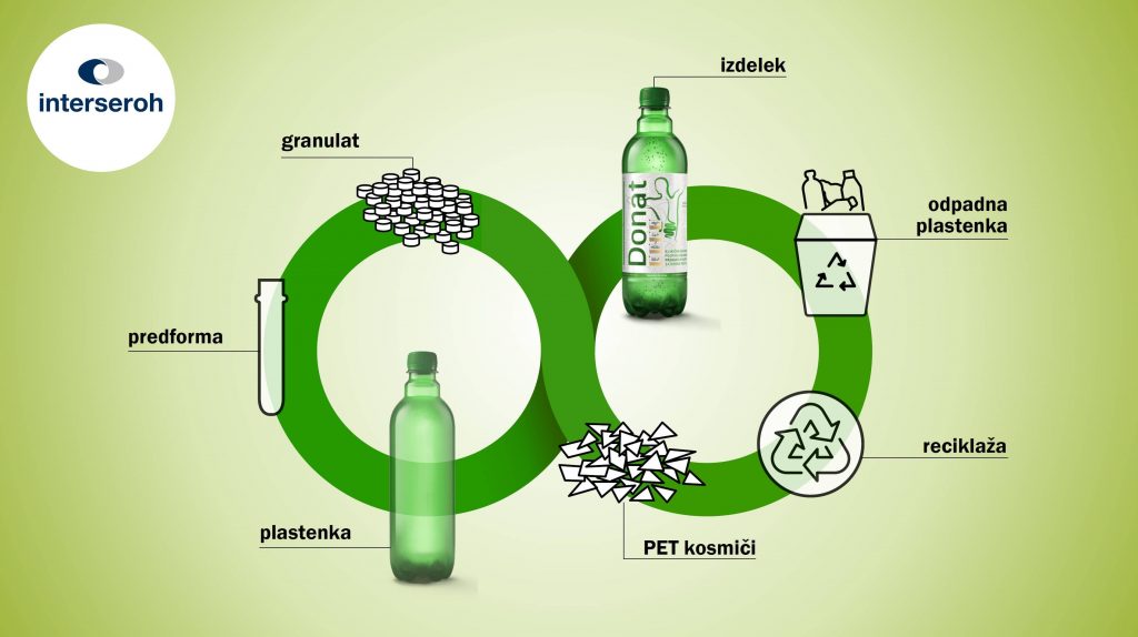 S pomočjo naprednih tehnologij odpadni plastični embalaži, med drugim tudi zeleni PET embalaži, podjetja tudi v Sloveniji že omogočajo ponovno uporabo. Ob tem je pomembno poudariti, da podjetja ne reciklirajo samo prozornih plastenk, ampak tudi zelenih (zelena za zeleno). Z novo strategijo in prenovo blagovne znamke Donat se je podjetje Atlantic Droga Kolinska namreč odločilo, da poišče najboljšo rešitev, ob dejstvu da današnji sodobni potrošnik posega po plastični embalaži, ki je bolj priročna in enostavna za uporabo. Skupaj s podjetjem Alpla so začeli uresničevati projekt, sistem popolnega krožnega (do zelenega za zeleno), katerega brez ostalih deležnikov za zbiranje in predelavo ne bi bilo možno izpeljati. Med njimi je tudi Interseroh, ki v sistemu popolnega sistema kroženja plastike iz odrabljene plastenke zagotovi sekundarne surovine za novo PET plastenko. V krožnem gospodarstvu namreč velja, da odpadek ne sme ostati odpadek, ampak je le vir ali surovina za nove izdelke. Ekonomija zaprte zanke tako s podaljševanjem življenjske dobe izdelkov zmanjšuje količino odpadnih materialov in ohranja naravne vire. Za hitrejši prehod v trajnejšo, pametno družbo je Evropska komisija leta 2015 ambiciozno predlagala, da bi do leta 2025 v Evropski uniji reciklirali najmanj 55 % vse plastične embalaže.