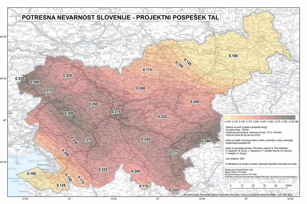 Karta potresne nevarnosti Slovenije – projektni pospešek tal je priloga Nacionalnega dodatka in je kot del predpisov obvezna za projektiranje stavb. “EC8 določa, da je osnovni parameter potresne nevarnosti projektni pospešek tal za povratno dobo 475 let in za trdna tla (tip tal A po EC8),” povedo na Agenciji za okolje, ki je v letu 2021 skupaj z Geološkim zavodom Slovenije uspešno zaključila večletni projekt razvoja novega modela potresne nevarnosti Slovenije.