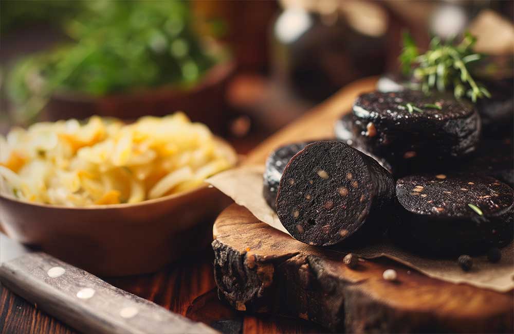 V pekač zlagajte plast kisle repe in plast na kolobarje narezane krvavice. Zapecite hrustljavo!