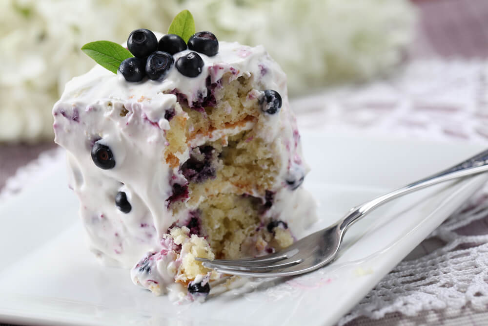 Spečete klasično vanilijevo pecivo za torte, preprežete, namažete s kislo smetano, zmešano s sladkorjem v prahu ter posujete z borovnicami.