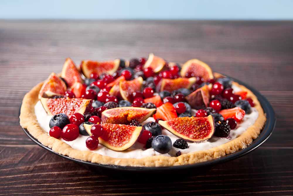 Testo spečete po navodilih. Ko se ohladi, ga obložite z mešanico stepenega mascarponeja in stepene sladke smetane. Po vrhu naložite razrezane sveže fige in borovnice in pokapate z medom, lahko pa tudi z “ostankom od namakanja”