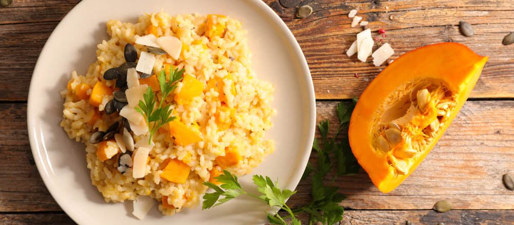 Tudi jeseni prija dobra rižota. Da ne bo le gobova, tokrat brezmesna rižota z bučo – kremna, okusna in še lepo obarvana za povrhu. Sestavine: 6 skodelic jušne osnove (lahko je zelenjavna ali piščančja, lahko pa tudi bučna) skodelica v pire spasirane buče (najboljša bo, če jo spečete, ne skuhate) 3 sesekljane šalotke ali 2 … Nadaljujte z branjem Jesensko kosilo: Kremna rižota z bučo