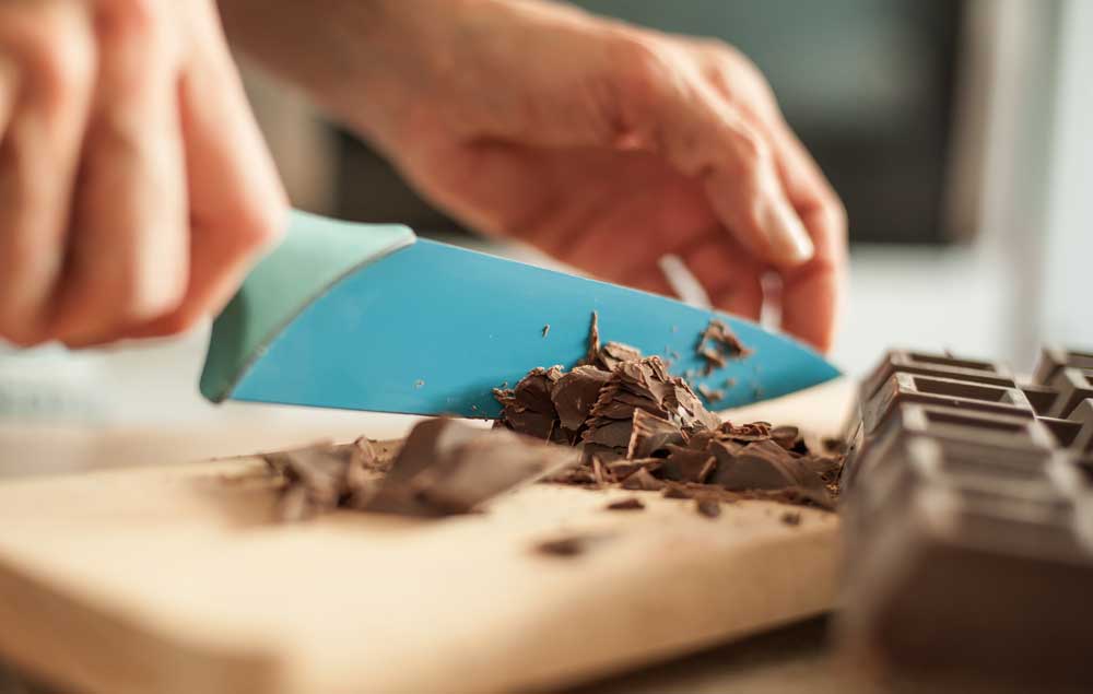 Olupite in narežite jabolka na koščke ter jih kuhajte v vodi okoli 15 minut, da se zmehčajo. Med tem stopite čokolado v mikrovalovni pečici ali nad paro.