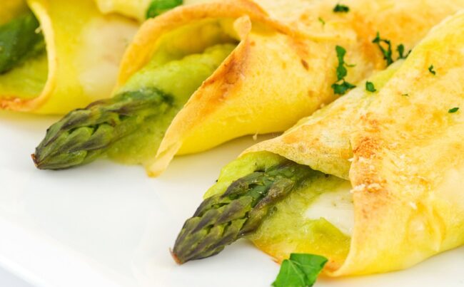 RECEPT: Palačinke s šparglji in slanino (z okusno omako)