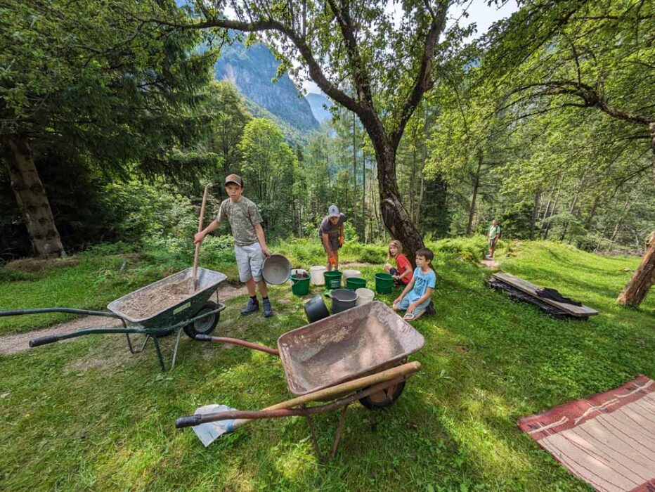 Tako je bilo tudi v soboto, 8. junija 2024, ko se je 18 mladih nadzornikov pod vodstvom Mojce Pintar in Jerneja Legata odpravilo na pravo delovno akcijo v Posočje. Z avtobusom so se odpeljali do Kugyjevega spomenika ob cesti z Vršiča v Trento. Tam sta jih čakala naša sodelavca iz Trente Marko Pretner in Miran Hosner ter traktor, poln peska.