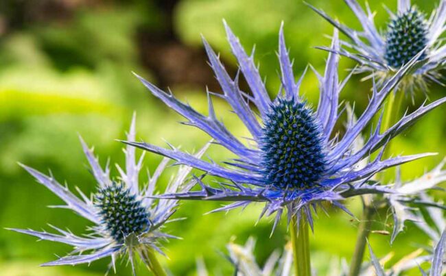 Alpsko možino (Eryngium alpinum) prepoznamo po socvetju, ki spominja na moder ali modro vijoličen storž, ter po listih okrog socvetja, ki so pernato nacepljeni, ščetinasti in bodeče nazobčani.