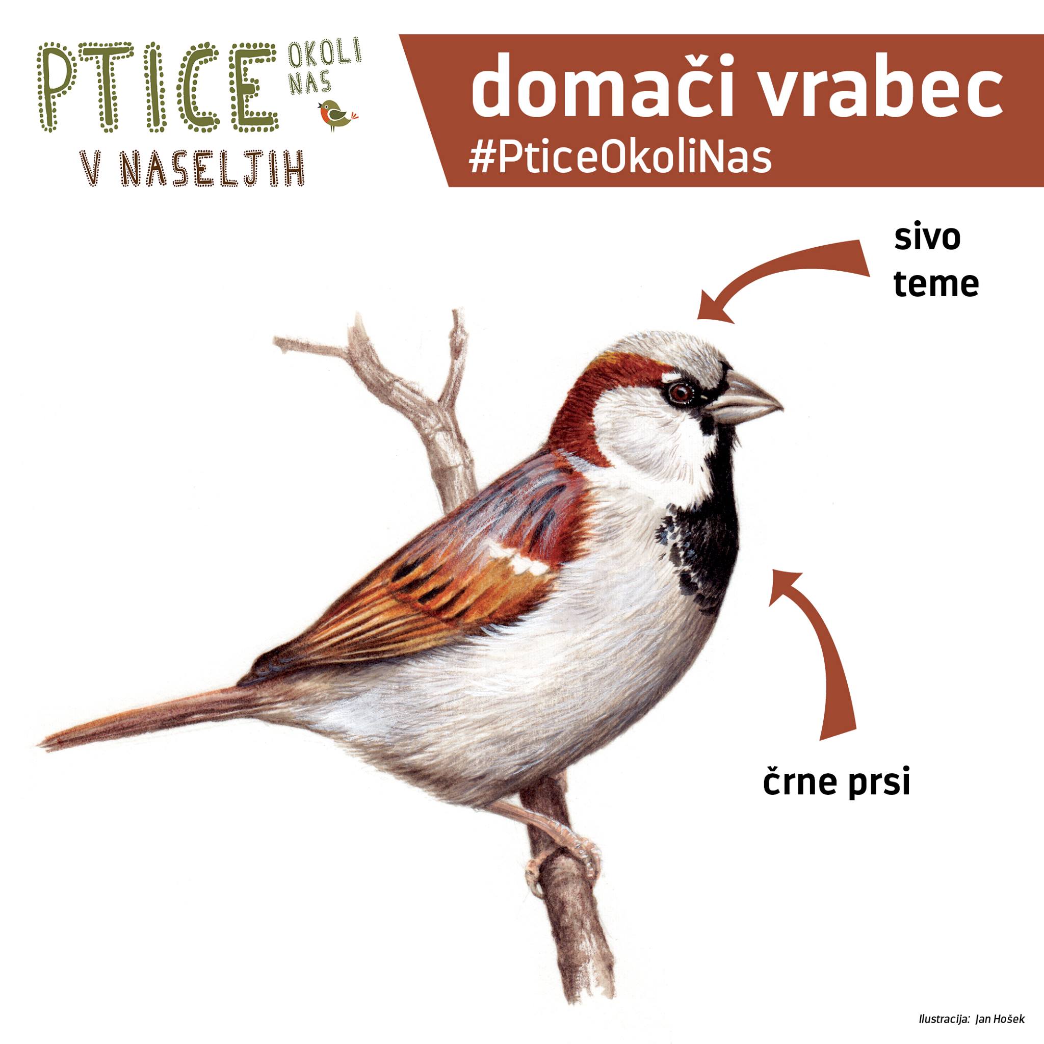 Domači vrabec (Passer domesticus) je vrsta stalnica pri nas, za katero je značilna družabna narava, ki se najbolj izraža pozimi, ko skupinsko iščejo hrano, se čistijo in počivajo.