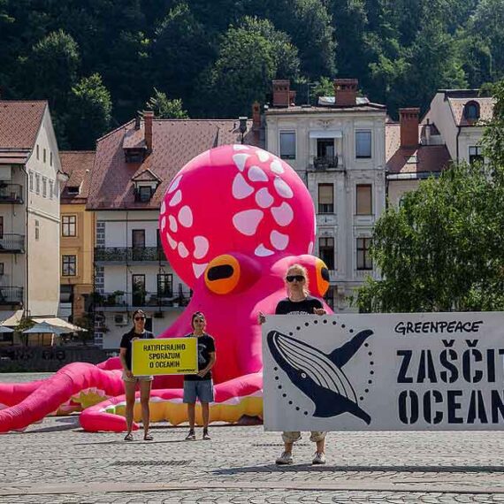 Aktivisti Greenpeacea so na Novem trgu v Ljubljani postavili deset metrsko instalacijo hobotnice s sporočilom “Zaščitimo oceane”, kot poziv zunanji ministrici in predsedniku vlade k čimprejšnji ratifikaciji Sporazuma Združenih narodov za zaščito oceanov.
