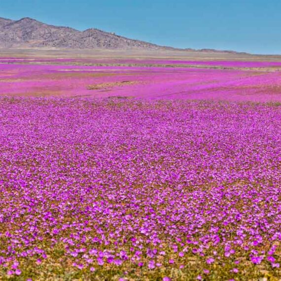 Puščava Atacama v severnem Čilu je eden najbolj suhih krajev na Zemlji, vendar so deli njenega običajno pustega peska trenutno prekriti s pisanim cvetjem belih in vijoličnih cvetov.