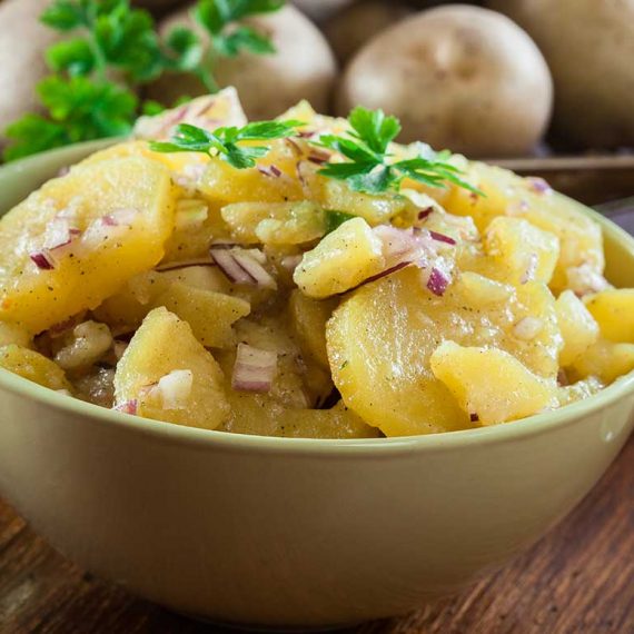 Krompir v solati je klasična priloga za k dunajskim zrezkom, ker je hladna priloga, pa je odlična spremljevalka žar dobrot na vseh...
