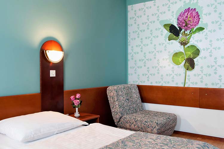 Manjši družinski hotel s 50 ležišči v dvoposteljnih in povezanih družinskih sobah, gostom nudijo nočitev z zajtrkom, pol ali polni penzion.