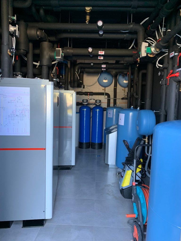 V fazi projektiranja rešitve je bilo kar nekaj pomislekov, ali se bo možno izogniti uporabi plina, še posebej za pripravo tople sanitarne vode in izpolnjevanje sanitarnih zahtev. Kljub višjemu začetnemu vložku, se je investitor odločil za predlagano rešitev s posebnimi Kronotermovimi toplotnimi črpalkami zemlja-voda WPG, za katere je bilo izdelanih 16 geosond.
